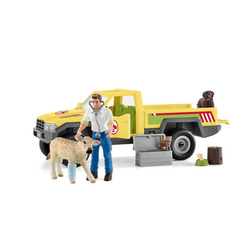 Conté: 1 camioneta, 1 veterinari, 1 vedell, 1 pagès Retriever femella, 1 gatet, 1 caixa d'alumini, 1 estetoscopi, 1 embenat, 1 bol, 1 os, 1 tronc d'arbre, 1 fulla d'adhesius.