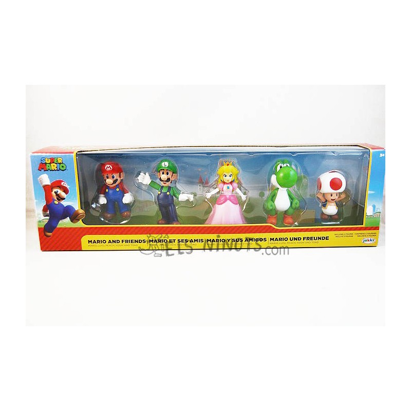 Pack de 5 figures de la col·lecció Super Mario Bros amb els personatges següents: Mario, Luigi, Yoshi, princesa Peach i Toad