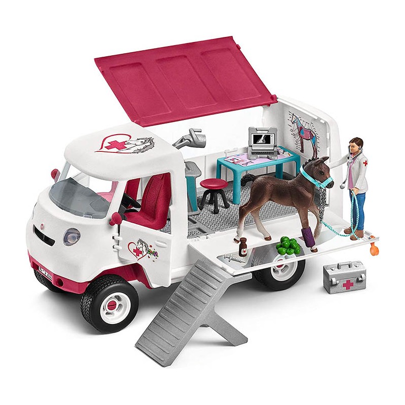 Contiene: 1 x coche, 1 x cujer veterinaria, 1 x potro hannoveriano, 1 x maletín médico, 1 x estetoscopio, 1 x inyección, 1 x botella para la medicación, 1 x ordenador portátil, 1 x aparato de rayos X, 1 x mesa, 1 x silla, 1 x hoja de adhesivos, 1 x instrucciones de montaje.