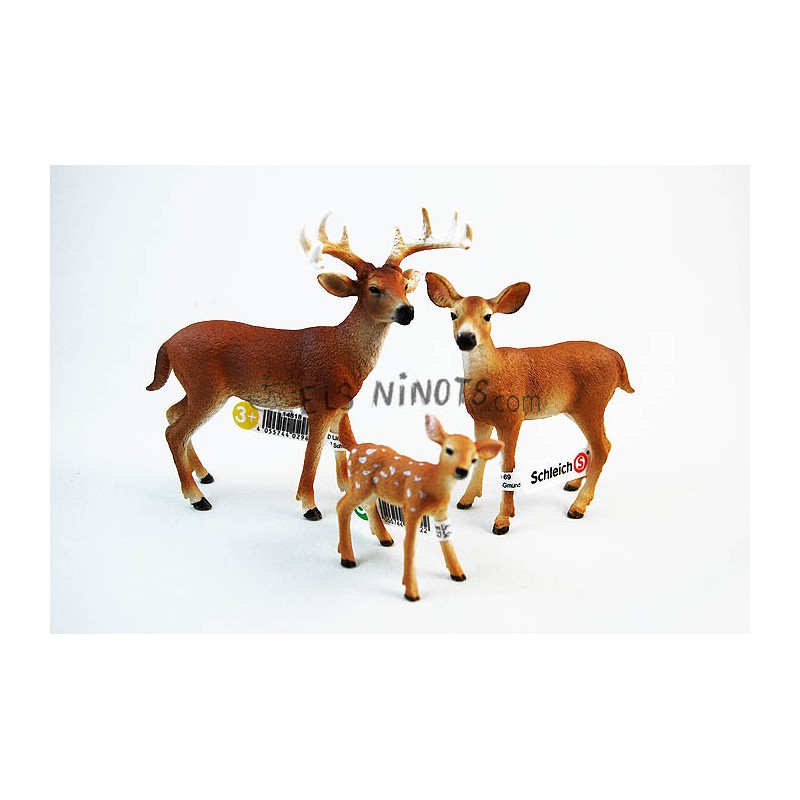 Pack figuras familia de Ciervos de cola blanca de la colección de animales Schleich, figuras como: Ciervo de cola blanca macho, Ciervo de cola blanca hembra y Cervato de cola blanca. Ref: 14818, 14819, 14820.