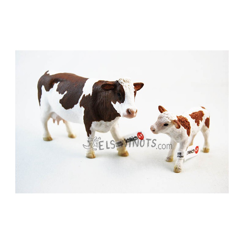 Pack de 2 figuras de la colección el Mundo de la granja de la marca Schleich, Vaca Fleckvieh y ternero Fleckvieh última edición.