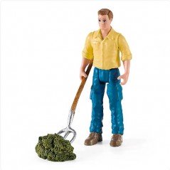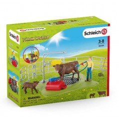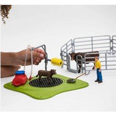 1x agriculteur, 1x vache, 1x veau, 1x fourche, 1x botte de foin, 5x clôture en saule, 1x portail, 1x brosse à vache, 1x support pour brosse à vache, 1x poteau, 1x plaque de base avec plateau tournant, 1x tuyau, 1x pompe avec fonction jet d’eau