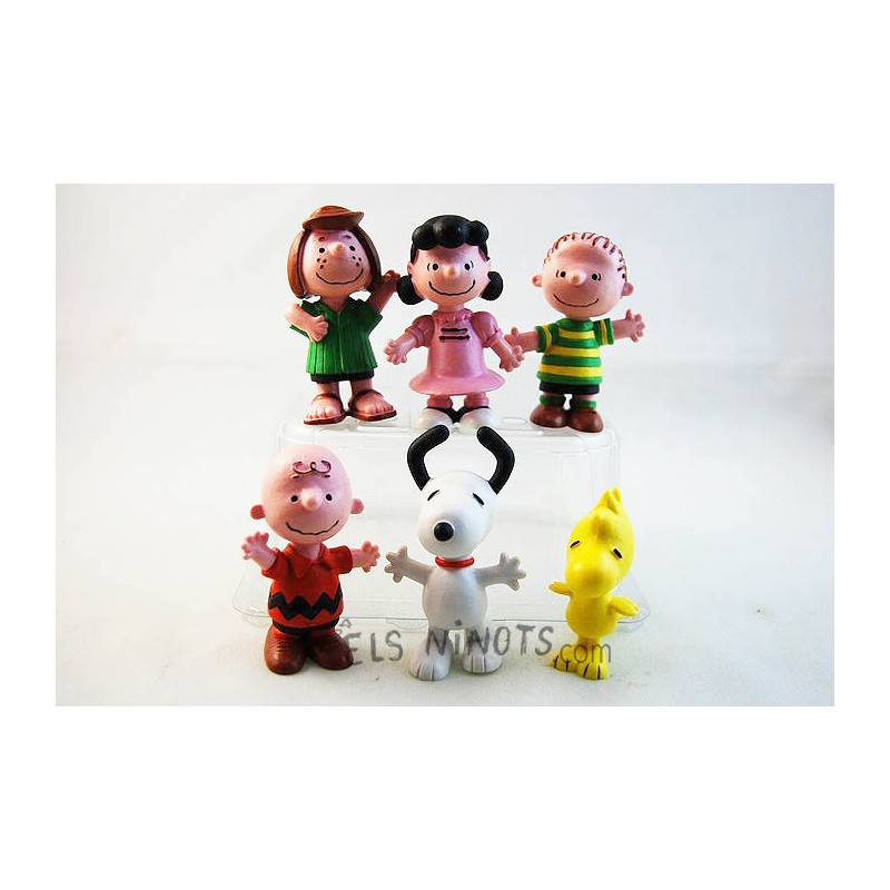 Collection de figurines Snoopy de Maria Borges avec les personnages suivants : Snoopy, Charlie Brown, Lucy, Linus, Peppermint Patty et Woodstock