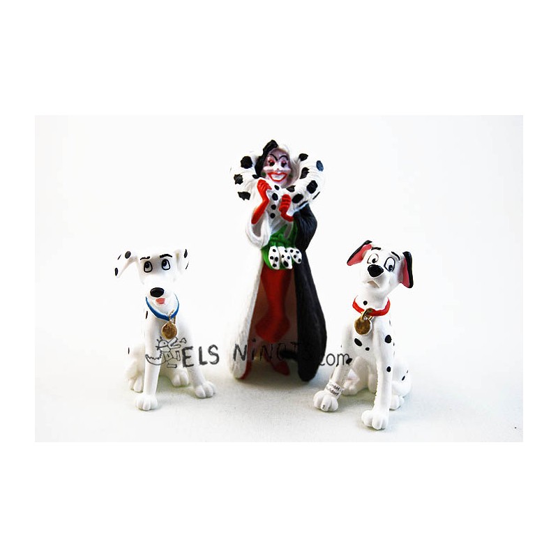 Pack de 3 figurines dans la collection 101 Dalmatiens Disney marque Bullyland avec les personnages suivants : Cruella, Pongo, Perdita.